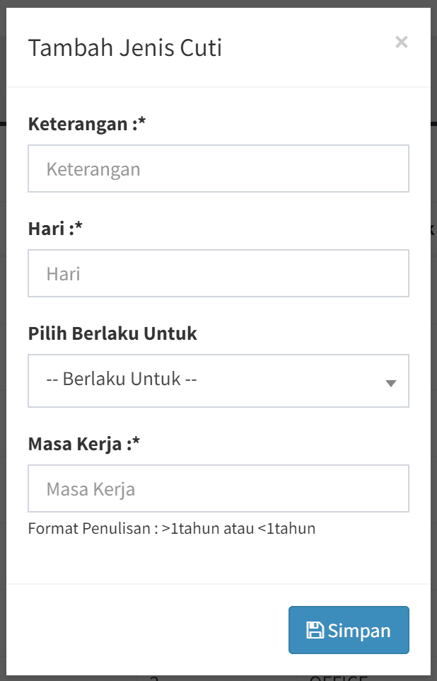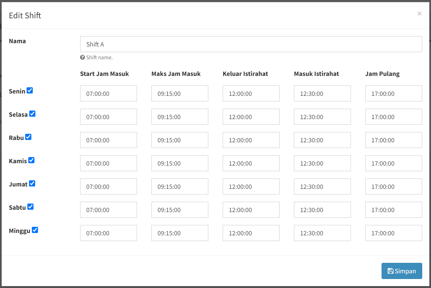 Nama, Tanggal, Type, Shift, Datang, Istirahat Keluar, Istirahat Masuk, Pulang, Jam Kerja, Datang Terlambat, Terlambat Masuk IstirahatPada halaman attedance admin juga bisa mengexport data attendance yang ada ke