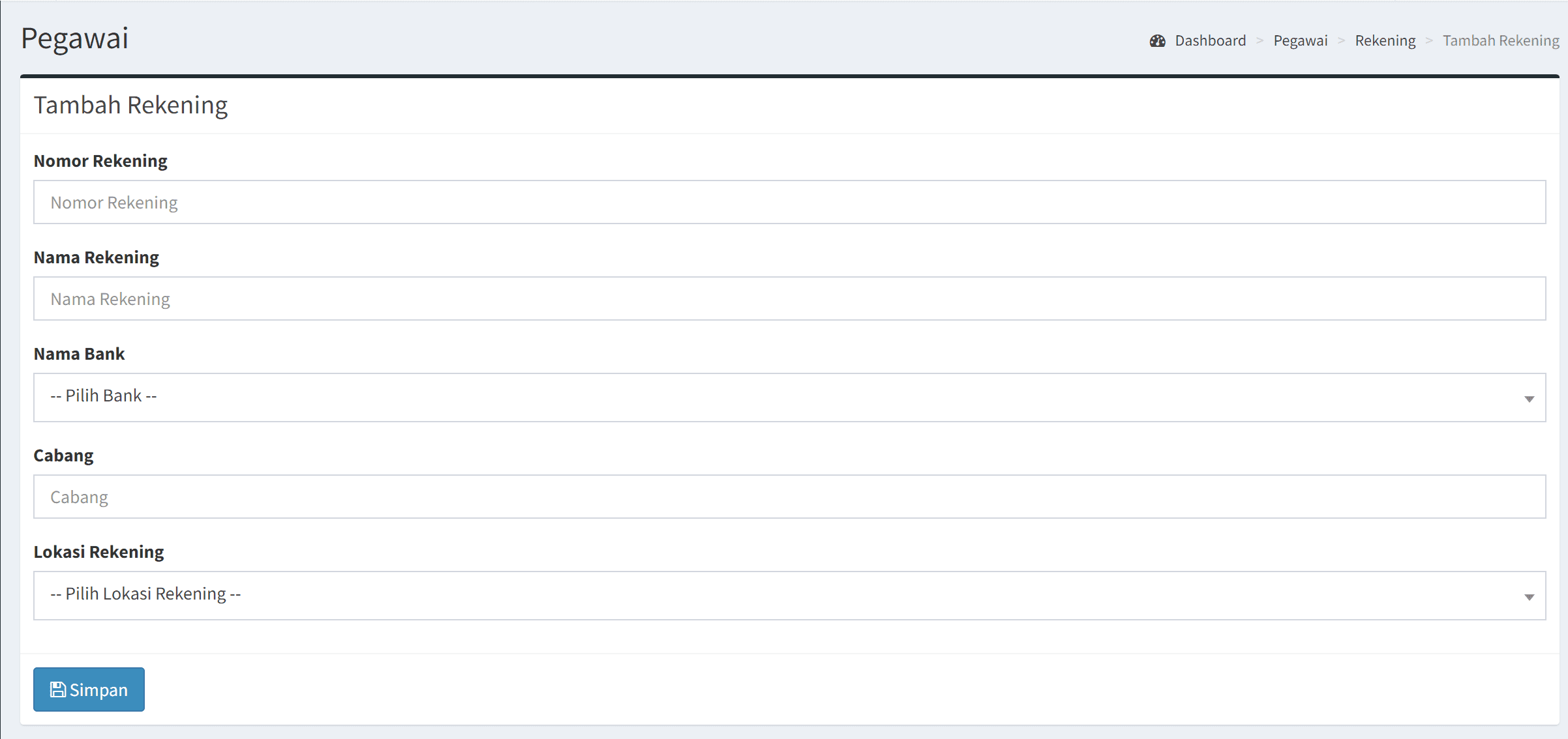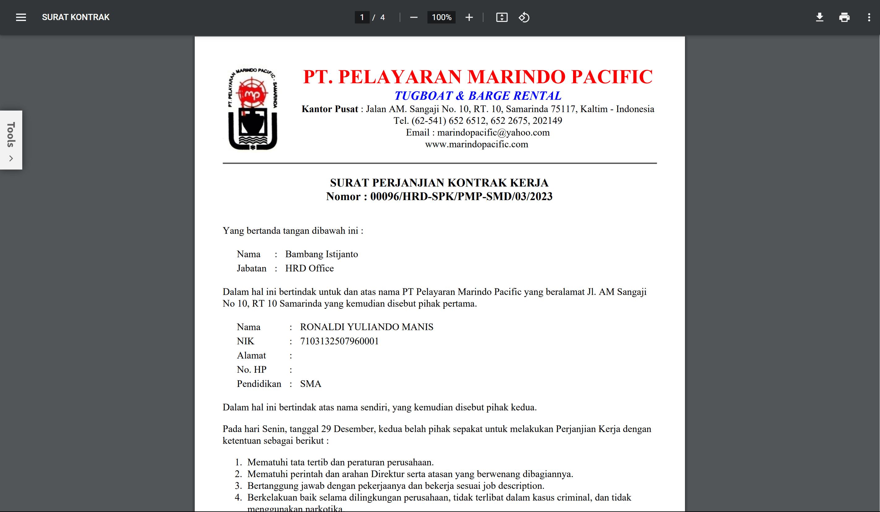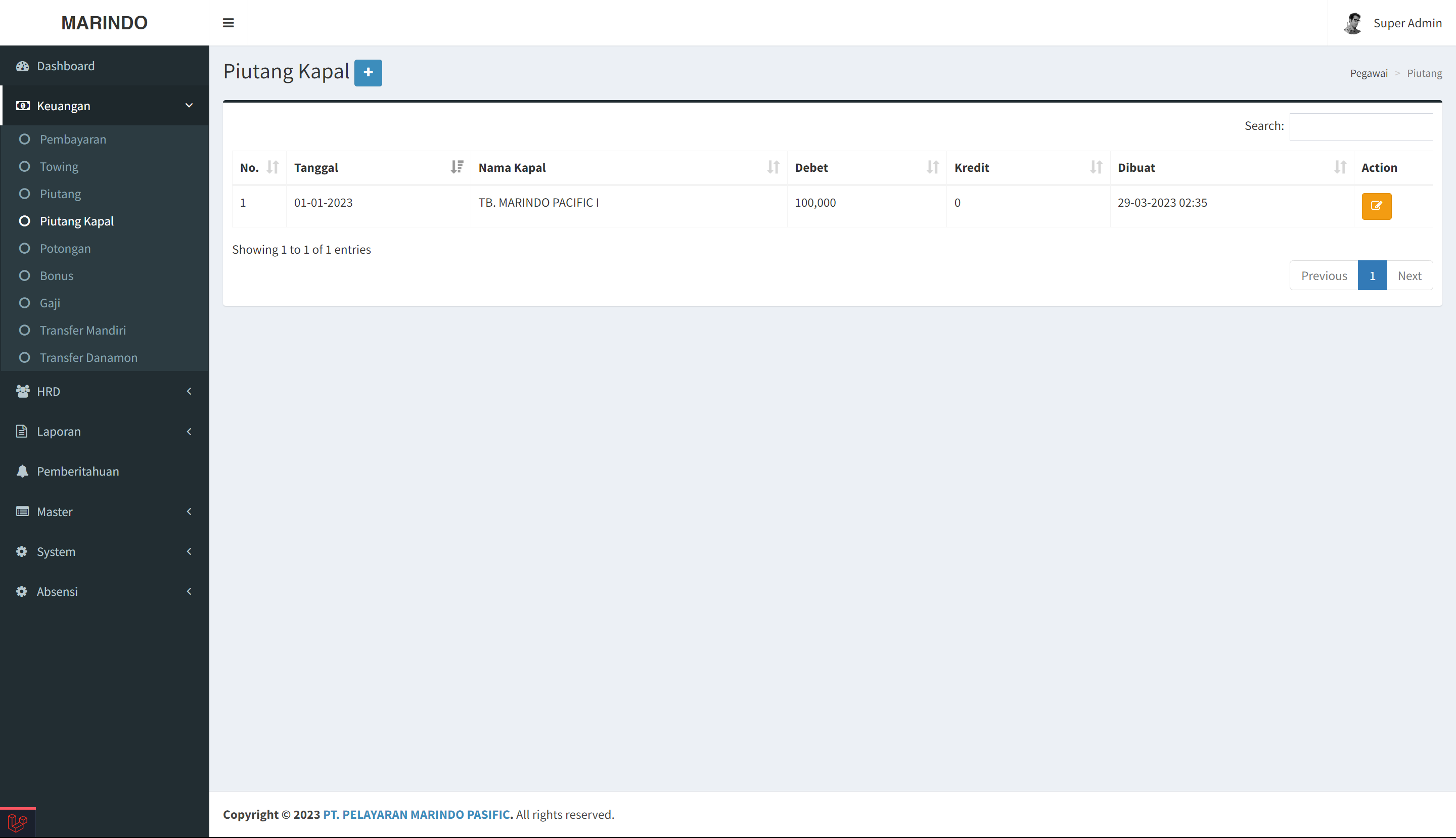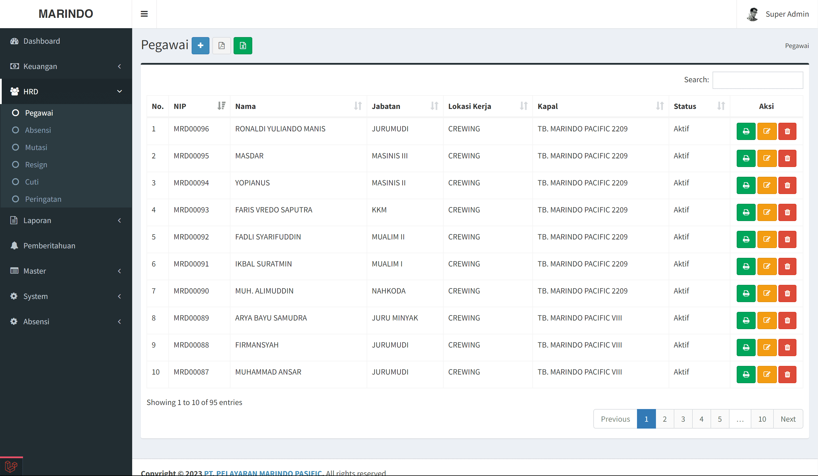 Tanggal Masuk (Sudah tidak dapat dirubah), NIP (Sudah tidak dapat dirubah), NPWP, Keahlian Dasar, Pendidikan Terkahir, Lokasi Kerja Pegawai, Pilih Kapal, Departemen, Jabatan, Status Kepegawaian, Status Kawin, Lokasi Pajak, Status Pegawai, Tanggal Keluar (Data ter isi apabila karyawan resign), dan memilih berbagai fasilitas untuk karyawan (BPJS, JKK, JKM, JHT, IP)dan tekan tombol Simpan
