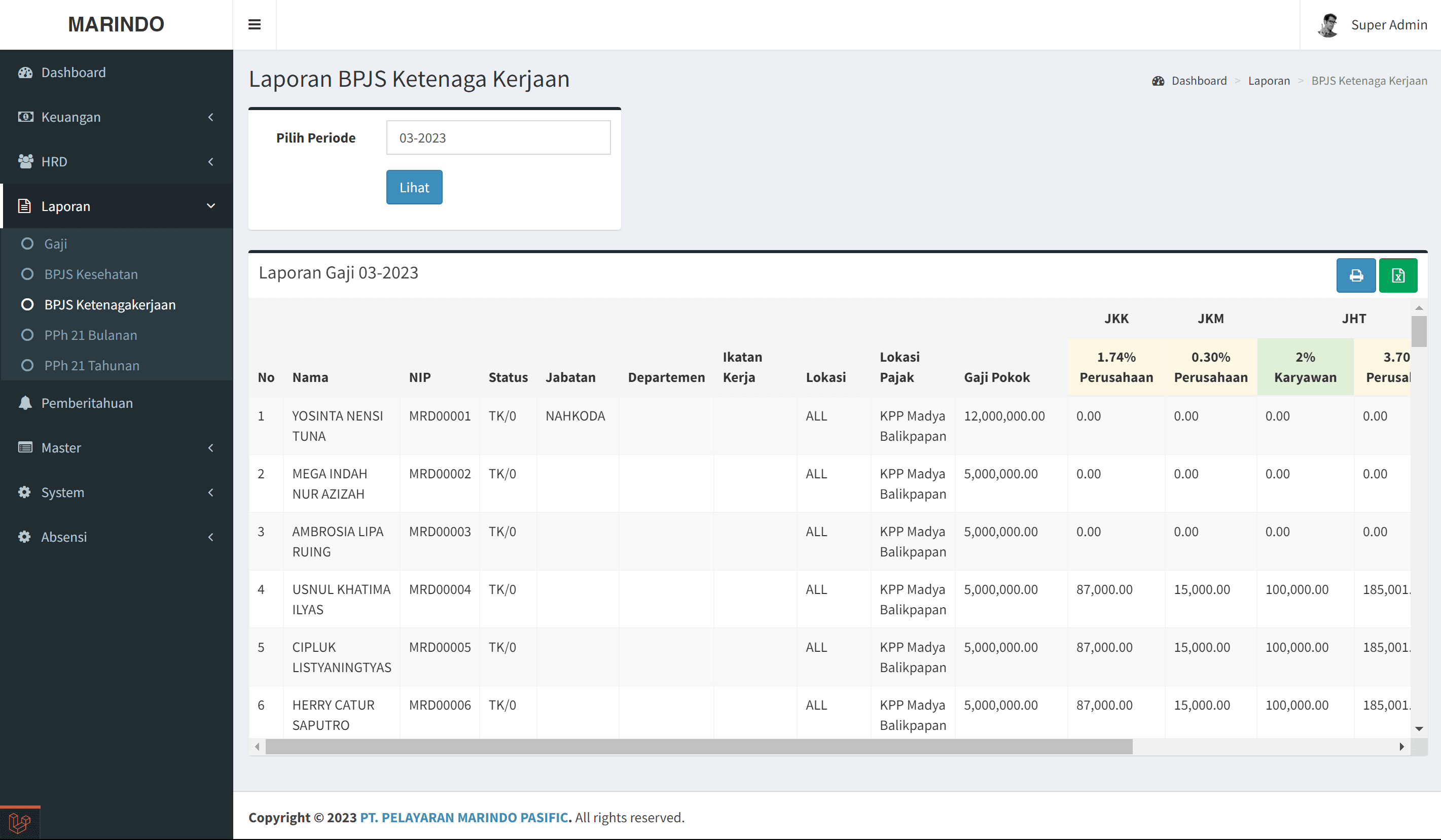 Setelah memilih periode bpjs ketenagakerjaan yang ingin ditampilkan maka akan muncul data keseluruhan bpjs ketenagakerjaan pada periode tersebut. Pada detail bpjs ketenagakerjaan ini anda bisa mencetak atau mendownload file excel dari laporan BPJS Ketenagakerjaan tersebut.