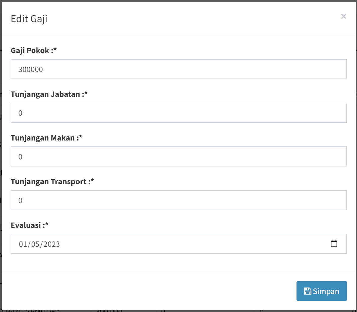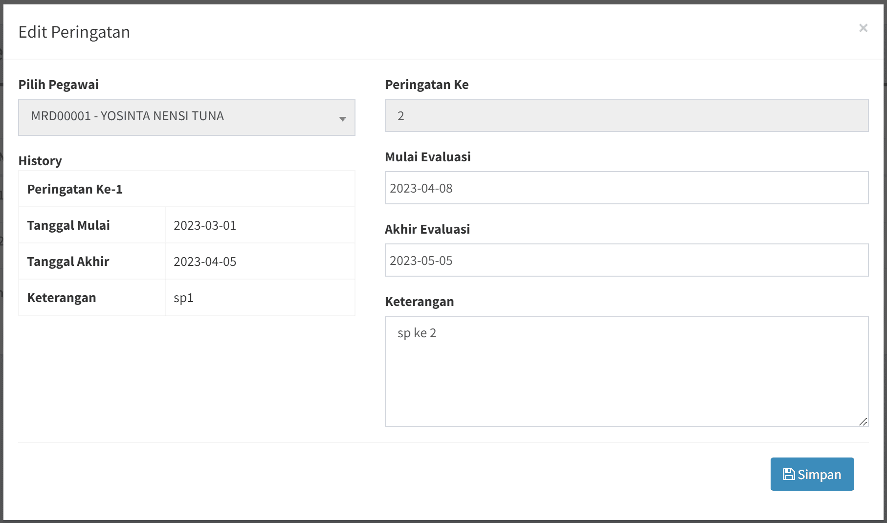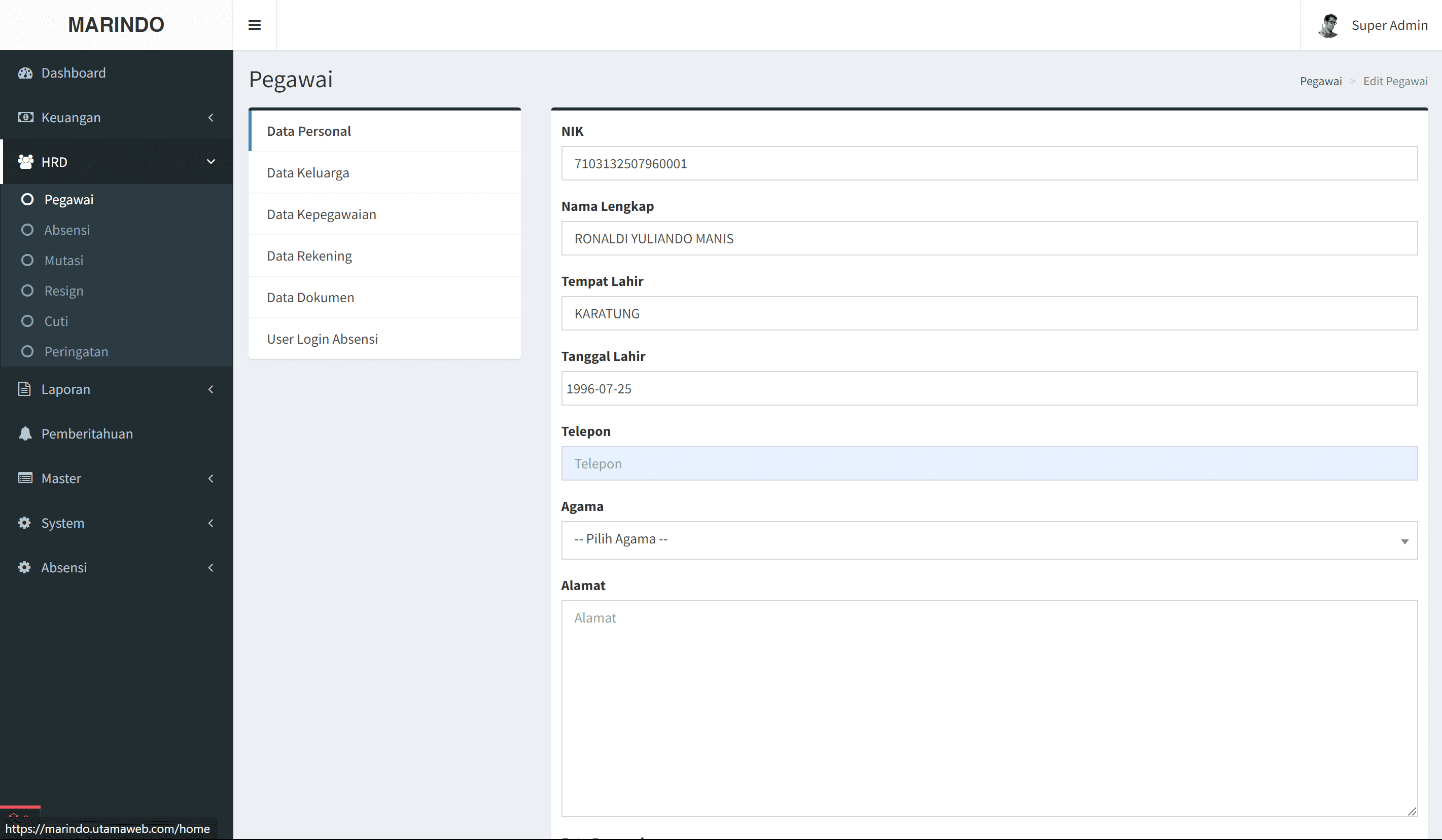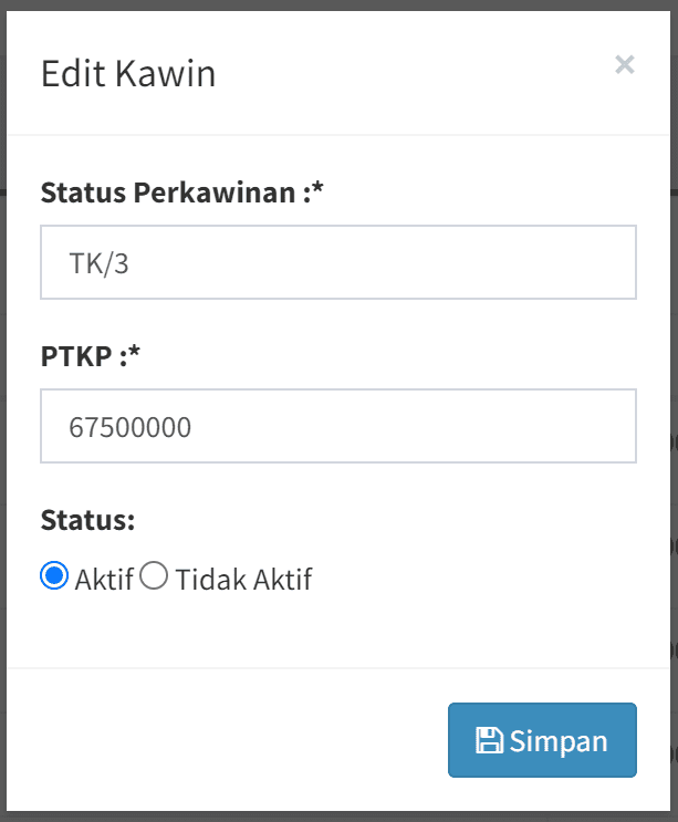 Tanggal Masuk (Sudah tidak dapat dirubah), NIP (Sudah tidak dapat dirubah), NPWP, Keahlian Dasar, Pendidikan Terkahir, Lokasi Kerja Pegawai, Pilih Kapal, Departemen, Jabatan, Status Kepegawaian, Status Kawin, Lokasi Pajak, Status Pegawai, Tanggal Keluar (Data ter isi apabila karyawan resign), dan memilih berbagai fasilitas untuk karyawan (BPJS, JKK, JKM, JHT, IP)dan tekan tombol Simpan