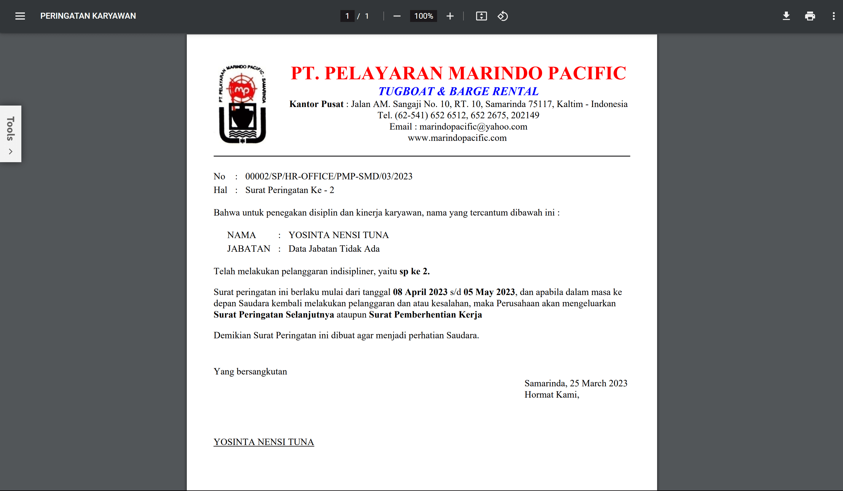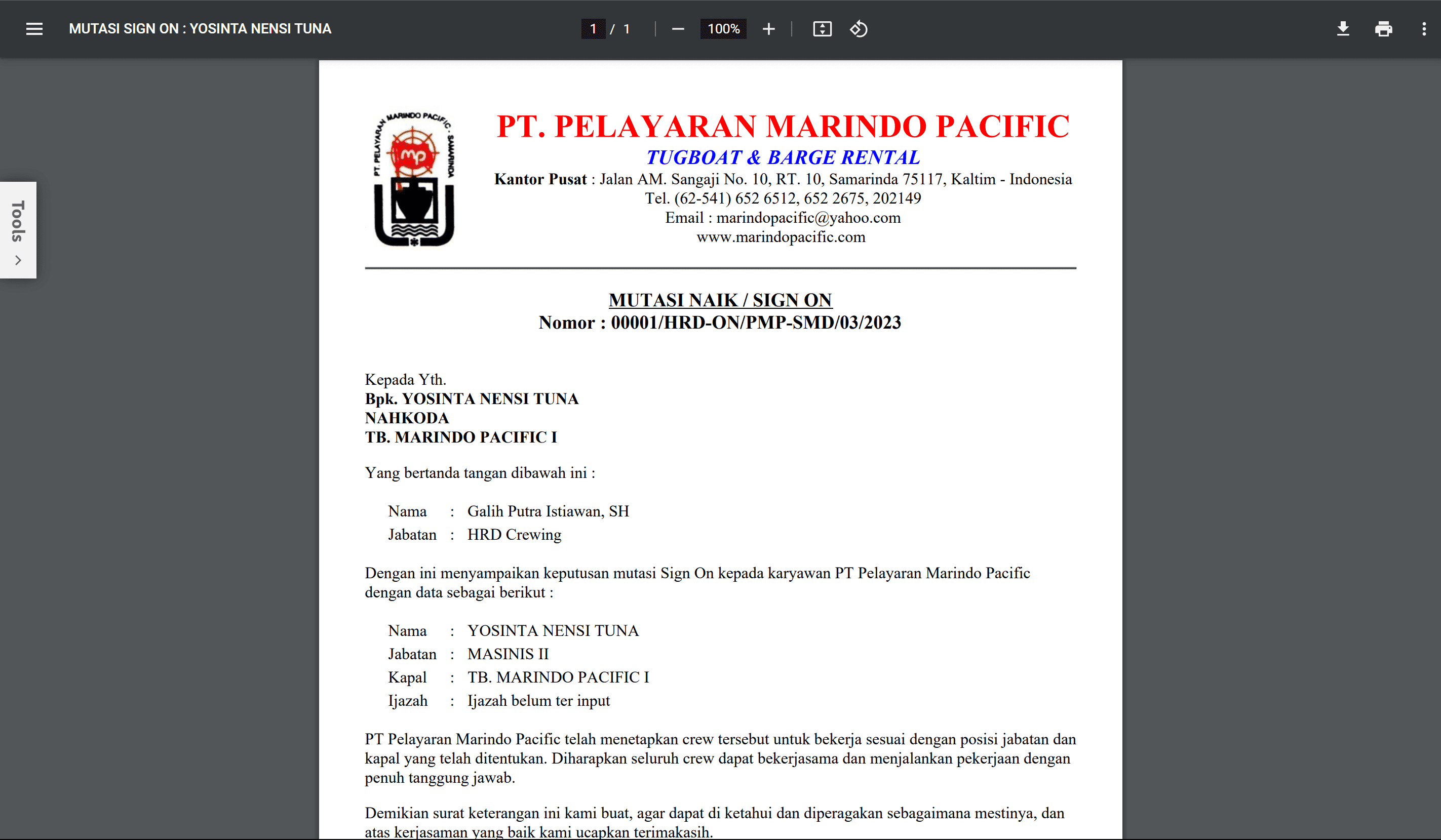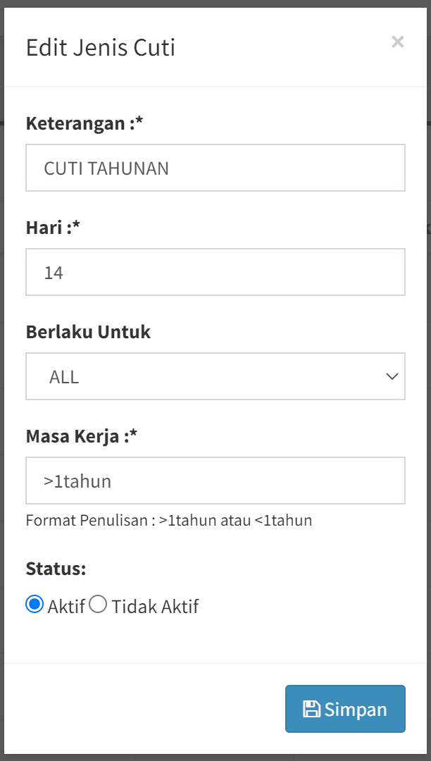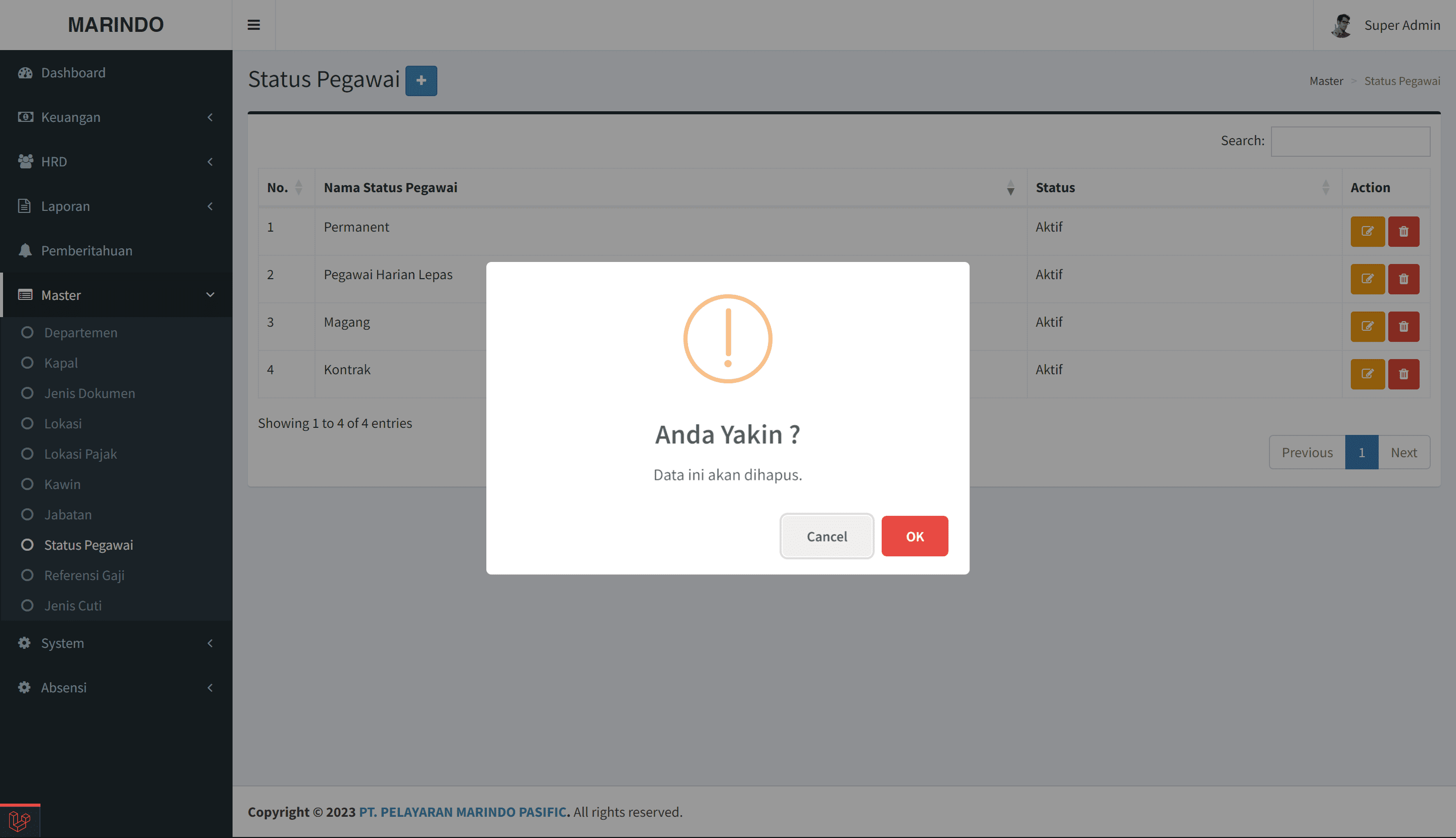 Tanggal Masuk (Sudah tidak dapat dirubah), NIP (Sudah tidak dapat dirubah), NPWP, Keahlian Dasar, Pendidikan Terkahir, Lokasi Kerja Pegawai, Pilih Kapal, Departemen, Jabatan, Status Kepegawaian, Status Kawin, Lokasi Pajak, Status Pegawai, Tanggal Keluar (Data ter isi apabila karyawan resign), dan memilih berbagai fasilitas untuk karyawan (BPJS, JKK, JKM, JHT, IP)dan tekan tombol Simpan