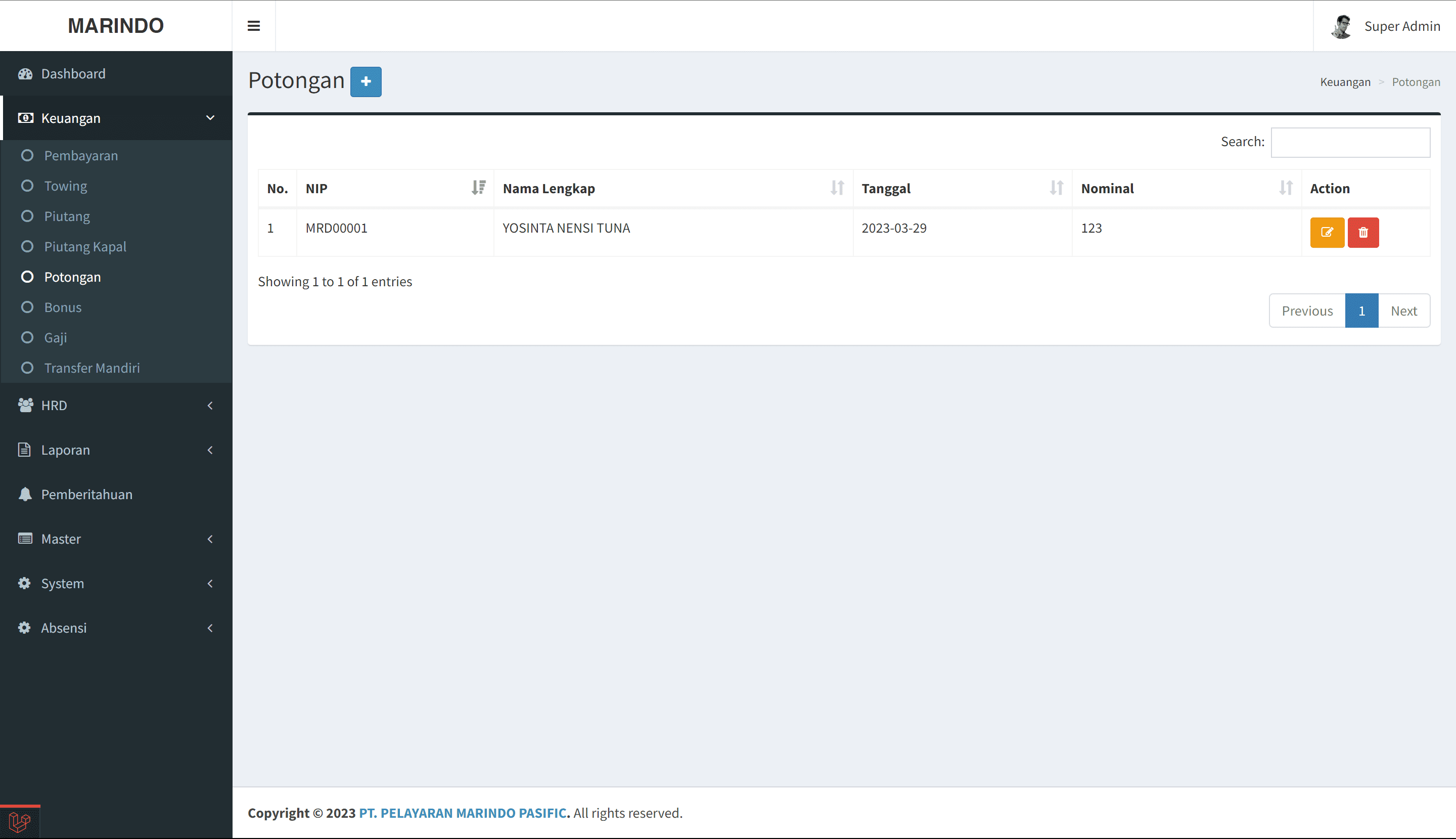 Data pengaturan absensi untuk MARINDO PAYROLL