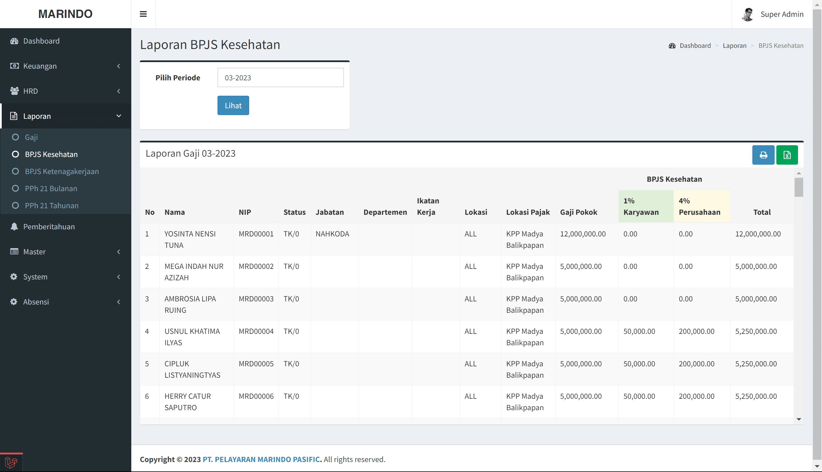 Setelah memilih periode bpjs ketenagakerjaan yang ingin ditampilkan maka akan muncul data keseluruhan bpjs ketenagakerjaan pada periode tersebut. Pada detail bpjs ketenagakerjaan ini anda bisa mencetak atau mendownload file excel dari laporan BPJS Ketenagakerjaan tersebut.